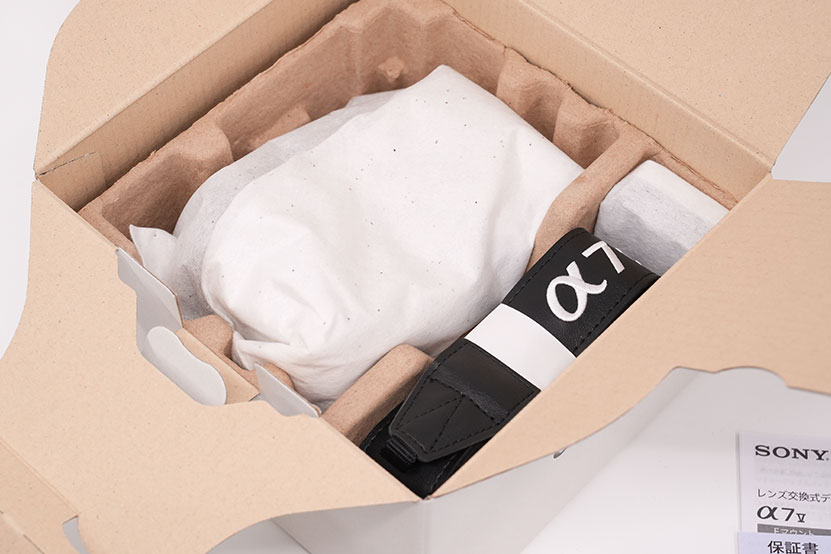 めちゃめちゃエコを意識した再生紙を使用したと思われる白い箱は、質感どうのこうのって言われそうですが、そんなものは関係ありません。個人的には、カメラのイラストに、ロゴがモノトーンで表現されているのは、カッコ良くて好き♪ α1 IIでも同じような仕様ですので、並べて飾りたくなるくらいです。