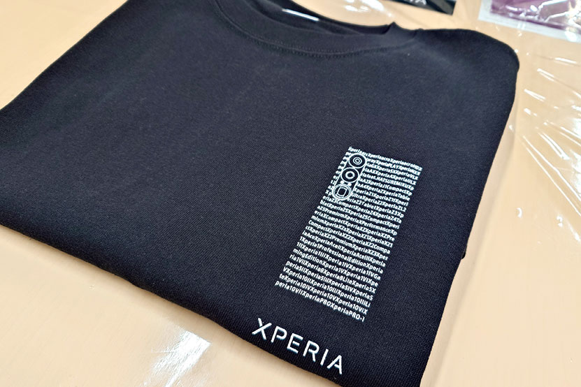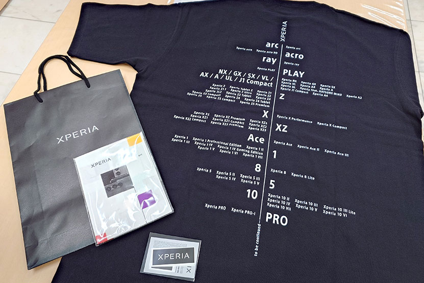 Tシャツに手ぬぐい、ステッカーなどなど。Xperiaの紙袋も、なかなかレアでカッコいい♪ Tシャツは XLサイズが用意され、MやLサイズを普段着用する男性なら、パーカーなどの上から着用するのも良きサイズ感。